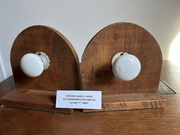 Bookends made of wood and doorknobs from convent 327 East 9th Street, the original motherhouse.